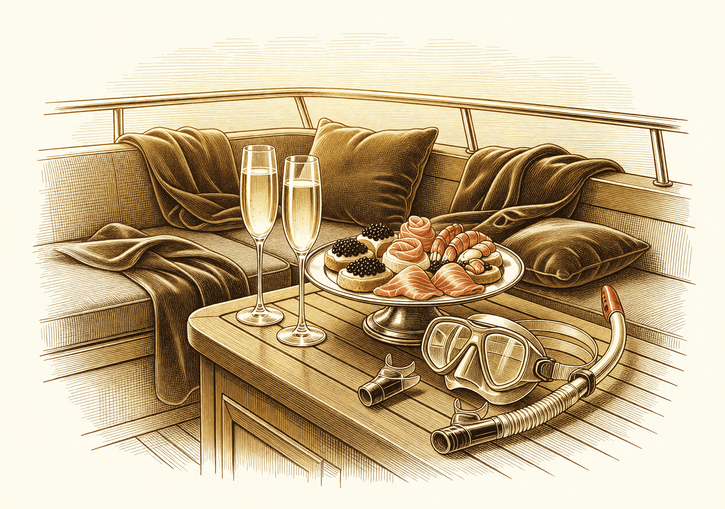 Gourmet catering, premium beverages, snorkelling gear, and a vessel equipped for comfort. You bring the guests — we handle everything else.